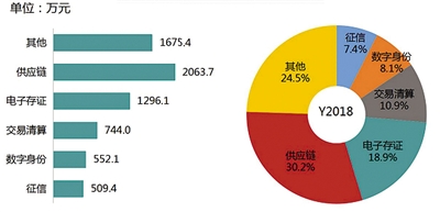从区块链产品应用结构细分领域来看,2018年,呈现以供应链领域的应用场景为主,同时存在征信、交易清算、电子存证、数字身份四大应用领域并存的产品结构。