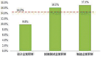 此外,2018年度集成电路行业的离职率基本保持稳定,主动离职率为14.3%。设计业主动离职率远低于产业链其他环节,为9.8%,其次是封测业,从业人员的主动离职率为16.1%,而制造业的主动离职率最高,达17.1%。