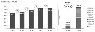 随着新一代信息技术的逐渐成熟、概念的虚热渐退、行业的理性洗牌,智能硬件行业从2014年开始进入了发展正轨。从全球市场规模来看,2014—2018年智能硬件终端产品出货量从19.9亿部(台)增至32.5亿部(台),同比增长率均在8%以上,智能硬件产品市场日渐稳定。预计到2025年,全球智能硬件终端产品出货量将进一步扩大到90.58亿部,年均复合增长率将达到13.5%。
