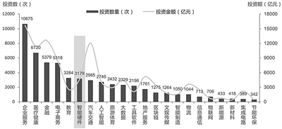 从各行业总体投资的平行视角来看,2014—2019年间,我国企业服务、医疗健康和金融服务累计投资数量位列全行业前三,投资数量(累计值)分别为10675、6720和5379次;投资金额(累计值)分别为15756亿元、11409亿元和12597亿元。中国智能硬件按累计投资数量统计位居第六名,投资数量(累计值)为3179次,投资金额(累计值)为4614亿元。