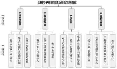 2019年综合发展指数形成产业发展规模、产业效率效益、产业创新和产业转型升级4个一级指标,13个二级指标的指标体系,数据基础以2018年国家统计局行业数据为主,辅以我部统计的电子信息制造业统计年报数据。