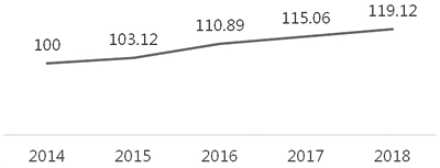 本年全国综合发展指数为119.12,比上年上升4.06个分值,与2014年基期(100)相比,近四年指数实现连续平稳增长,平均上升幅度为4.78个分值。