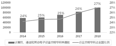 创新成果丰硕,产业活力和竞争力领先。电子信息制造业发明专利申请数占比指标得分105.44,连续三年稳步上升。电子信息制造业一直以来是创新最活跃的领域,2018年发明专利申请数量超过10万件,比上年增长20.4%,占全国发明专利申请数的27%,是国民经济各行业中占比最高的行业,比排名第二的电气机械和器材制造业发明专利占比高12个百分点。从电子信息制造业细分领域看,占比最高的分别是通信设备、电子器件制造、电子元件及电子专用材料制造三大领域,合计占电子信息制造业的77%。从发明专利授权量看,2018年我国发明专利授权量排名前3位的国内企业中,有两家都是电子信息制造业的公司,华为和欧珀移动分列第一和第三位。