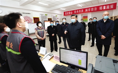 习近平首先来到北京市朝阳区安贞街道安华里社区,了解基层一线疫情联防联控情况。在社区居民委员会疫情防控指挥部,习近平听取了安贞街道和安华里社区开展联防联控情况介绍。习近平对社区采取多项措施,落实防控责任,实现入户排查、重点群体监控“两个全覆盖”等做法表示肯定。他强调,社区是疫情联防联控的第一线,也是外防输入、内防扩散最有效的防线。把社区这道防线守住,就能有效切断疫情扩散蔓延的渠道。全国都要充分发挥社区在疫情防控中的阻击作用,把防控力量向社区下沉,加强社区各项防控措施的落实,使所有社区成为疫情防控的坚强堡垒。要以疫情防控工作成效来检验和拓展“不忘初心、牢记使命”主题教育成果,发挥基层党组织政治引领作用和党员先锋模范作用,把社区居民发动起来,构筑起疫情防控的人民防线。