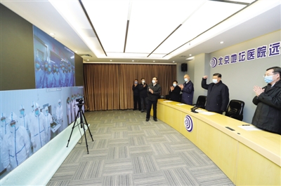 习近平十分牵挂湖北和武汉的疫情。在地坛医院远程诊疗中心,习近平通过视频连线武汉市收治新冠肺炎患者的金银潭医院、协和医院、火神山医院,向疫情防控一线的医务工作者、干部职工和人民解放军指战员了解情况、听取意见和建议。他强调,全国广大医务工作者不忘初心、牢记使命,响应党的号召,义无反顾冲上疫情防控第一线,同时间赛跑,与病魔较量,顽强拼搏、日夜奋战,展现了对党、对人民高度负责的精神面貌。他指出,现在疫情防控正处于胶着对垒状态,广大医务工作者一定要坚持下去,发扬特别能吃苦、特别能战斗的精神,发挥火线上的中流砥柱作用,始终把人民群众生命安全和身体健康放在首位,全力以赴救治患者,打好武汉保卫战、湖北保卫战。