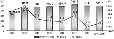 软件出口形势低迷。2019年,全国软件和信息技术服务业实现出口505.3亿美元,同比下降1.1%。