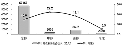 东部地区稳步发展,中西部地区软件业加快增长。2019年,东部地区完成软件业务收入57157亿元,同比增长15.0%,占全国软件业的比重为79.6%。中部和西部地区完成软件业务收入分别为3655亿元和8607亿元,同比增长22.2%和18.1%;占全国软件业的比重为5.1%和12.0%,比上年提高0.1个和0.6个百分点。东北地区完成软件业务收入2350亿元,同比增长5.5个百分点,占全国软件业的比重为3.3%。
