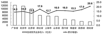 主要软件大省保持稳中向好态势,部分中西部省市快速增长。软件业务收入居前5名的广东、北京、江苏、浙江、上海共完成收入45623亿元,占全国软件业比重的63.6%。软件业务收入增速高于全国平均水平的省份有16个,其中增速高于20%的省份集中在中西部地区,包括广西、云南、贵州、宁夏、安徽、江西、湖南等省份。