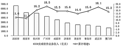 重点城市软件业集聚发展态势更加明显。2019年,全国4个直辖市和15个副省级中心城市实现软件业务收入59636亿元,同比增长16.4%,占全国软件业的比重为83.1%。其中,副省级城市实现软件业务收入38640亿元,同比增长14.6%,占全国软件业的比重为53.8%。