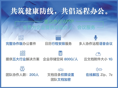 此外,金山办公还为多地政府及医疗机构提供了具备远程办公功能的WPS+产品。截至2月6日,赠送数量已达五万九千余套。2月13日起,黑龙江省齐齐哈尔市政府发起远程办公推广活动,面向该市需要在线协同办公的组织机构推广“WPS+云办公”远程办公,为不同领域的办公人群介绍“WPS+云办公”在抗疫战斗中的操作指南、使用技巧等。金山办公全力支持齐齐哈尔市抗疫工作,保障企事业单位不出门、不耽误工作并提高工作效率。