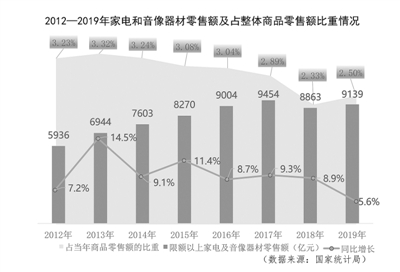 家电消费在我国国民消费中所占的比重依然很高,对我国消费升级起到重要作用。根据国家统计局数据,2019年我国主要商品零售额总额为364928亿元,其中,家用电器和音像器材类商品零售总额达9139亿元,占整体商品零售额比例约为2.5%。家用电器和音像器材类商品与化妆品类、通信器材类、体育娱乐用品类商品一起,成为我国消费升级类商品的四大典型,家用电器和音像器材类商品零售额增速比限额以上消费品零售额平均增速快1.7个百分点。