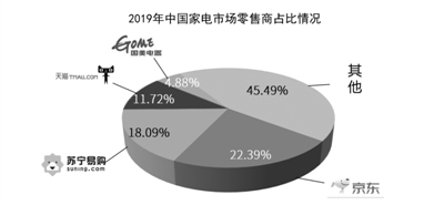 渠道格局正在改变。从渠道商格局看,家电零售市场约55%的份额集中在京东、天猫、苏宁易购、国美等在线上、线下拥有较大资源的渠道商手里,集中度情况基本与家电行业一致。其中,京东占比最大,达到22.39%;苏宁易购其次,占18.09%;天猫已经跻身第三大家电销售平台,占比达11.72%;国美则占比4.88%。