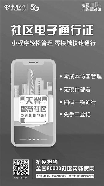 在四川,2月中旬,由内江市委政法委牵头,中国电信内江分公司创新研发的“电子通行证系统”在内江市正式上线运行。居民只要通过手机扫码,并按照指示填写姓名、联系电话、家庭住址、行程及健康信息等相关的个人信息,即可生成一个电子通行证,每次进出小区扫码刷证即可。