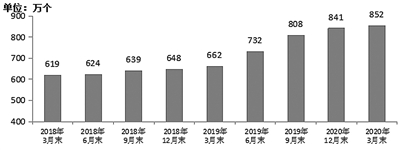 移动电话基站数持续较快增长。截至3月末,移动电话基站总数达852.3万个,同比增长28.8%。其中,4G基站总数为551万个,占比为64.7%。