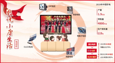 电视画面越来越“好看”。黑白电视、彩色电视、4K/8K电视……人们因着对美好生活的追求不断拓展技术的边界。随着国家大力推动超高清视频产业的发展,我国4K电视逐渐走向全面普及,2019年4K电视销量占比提升近70%,预计2020年有望超过80%。到2022年,8K电视占比将达到5%。