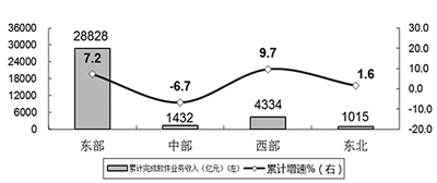 东、西部地区软件业收入保持较快增长。上半年,东部地区完成软件业务收入28828亿元,同比增长7.2%。中部地区完成软件业务收入1432亿元,同比下降6.7%。西部地区完成软件业务收入4334亿元,同比增长9.7%。东北地区完成软件业务收入1015亿元,同比增长1.6%,四个地区软件业务收入在全国总收入中的占比分别为:81.0%、4.0%、12.2%和2.8%。
