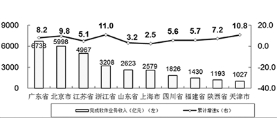 主要软件大省业务收入增速持续回升。上半年,软件业务收入居前5名的省份中,广东、北京、江苏、浙江和山东分别增长8.2%、9.8%、5.1%、11.0%和3.2%,5省市合计软件业务收入占全国比重为66.1%。