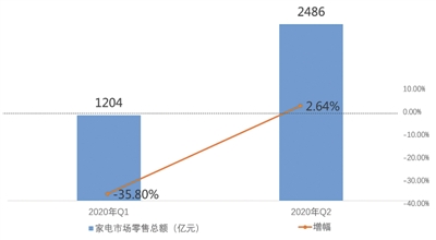 上半年家电消费市场受疫情冲击明显,但是,随着疫情防控向好的态势发展和各项促消费政策的落地生效,厂家商家积极调整措施到位,市场销售明显好转。分季度看,第一季度家电市场零售总额为1204亿元,同比下降35.8%;第二季度零售总额为2486亿元,两倍于第一季度,比去年同期微增2.64%。