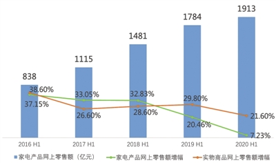 2020上半年,线下渠道家电产品零售额为1777亿元,同比下降29.3%;线上家电产品零售额为1913亿元,同比增长7.23%,线上渠道占整体家电零售额的比例达51.84%。