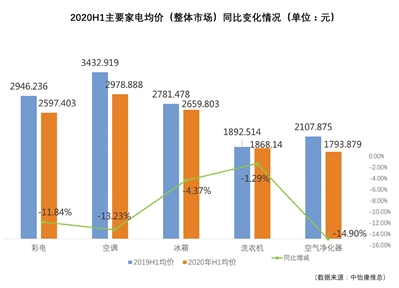 彩电品类符合疫情之下“宅经济”的需求,市场较早出现转机,需求提升。但是,受连续多年的价格战影响,彩电企业陷入降价惯性,尤其一再在线上杀价,导致线上均价同比下降11%,降低了整个行业的利润水平。2020上半年,中国彩电市场销售量同比下降9.3%,零售额规模同比降幅却达到20.44%。
