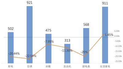 2020上半年,绝大多数家电品类出现不同程度的市场萎缩,遭遇“量额齐跌”的境遇,且零售额跌幅大于零售量跌幅。但是,疫情也使得洗碗机、吸尘器、消毒柜及部分生活小家电取得了不错的销量,市场规模扩大。从具体品类看,上半年彩电市场整体零售额502亿元,同比下降20.44%;空调整体零售额921亿元,同比下降22.54%;冰箱475亿元,下降7.95%;洗衣机313亿元,下降11.3%;厨房电器568亿元,同比下降20%;生活家电911亿元,是唯一没有下降的产品品类,与上年同比微增1.45%。