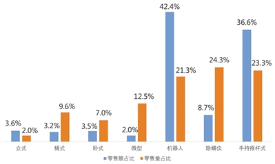 手持推杆式产品和机器人成为吸尘器市场两大主流产品,零售额市场份额占比分别为36.6%和42.4%。机器人零售量占比达21.3%,与手持推杆式产品占比几乎持平。卧式产品的市场占比急速下滑,零售额与零售量较去年降幅均达40%。除螨仪产品的零售量明显增长,但由于市场规模较小,并未形成对整体市场的拉动力。