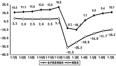 1—7月,规模以上电子信息制造业增加值同比增长6.7%,增速比去年同期回落2.4个百分点。7月份,规模以上电子信息制造业增加值同比增长11.8%,增速同比增长5.7个百分点。