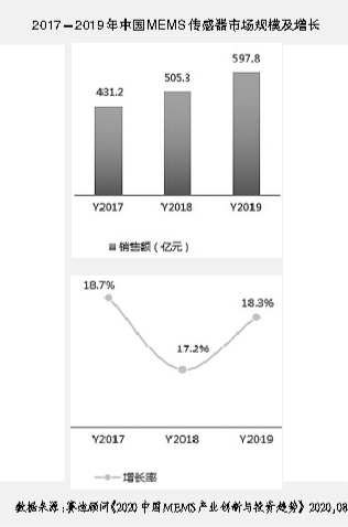 受宏观政策环境、技术进步与升级、物联网应用普及渗透等众多利好因素的影响,2019年中国MEMS市场规模接近600亿元,增长率达到18.3%。中国智能手机、平板电脑、可穿戴设备等MEMS应用整机产品产量保持稳定增长,带动加速传感器、陀螺仪、硅麦克风等产品需求的增长。与此同时,在上述整机产品中,加速传感器、陀螺仪、硅麦克风等渗透率的进一步提高,对MEMS市场规模的扩大也起到重要作用。另外,中国汽车工业的增长也推动了压力传感器、微机械陀螺仪等MEMS主力产品市场的增长。
