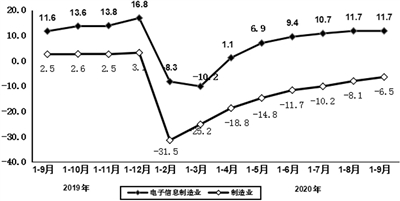 前三季度,规模以上电子信息制造业实现营业收入同比增长7.4%,利润总额同比增长15.5%,增速同比提高11.9个百分点。营业收入利润率为4.7%,营业成本同比增长7.3%。9月末,全行业应收票据及应收账款同比增长8.8%。