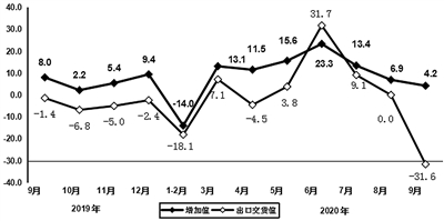 9月,通信设备制造业增加值同比增长4.2%,出口交货值同比回落31.6%。主要产品中,手机产量同比增长0.4%,其中智能手机产量同比增长3.4%。