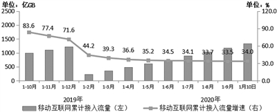 数据及互联网业务收入平稳增长,支撑电信业务收入稳步增长。1—10月,三家基础电信企业完成固定和移动数据及互联网业务收入分别为1923亿元和5180亿元,同比增长7.3%和2.5%,增速较1—9月均回落0.2个百分点,在电信业务收入中占比分别为17%和45.7%,分别拉动电信业务收入增长1.2和1.1个百分点。