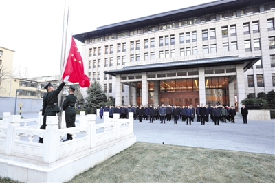 上午8时仪式开始。伴随着《歌唱祖国》的乐曲声,参加仪式的同志列队肃立,以坚毅的目光迎接旗手们护送国旗走上庄严的国旗台。在豪迈雄壮的国歌声中,鲜艳的五星红旗冉冉升起、高高飘扬,大家深情高唱国歌,面向国旗行注目礼。整个仪式简短庄重,振奋人心。