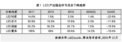 产业规模方面,受产能过剩和新冠肺炎疫情影响,2020年全球LED上游外延芯片产品和中游封装产业出现一定萎缩,但下游应用市场仍体现较强韧性,赛迪智库集成电路所预计,全球LED产业整体规模仍达到1660亿美元,同比小幅增加1.6%。其中,上游外延芯片规模由于光源价格下行,预计规模为96.4亿美元,同比降低18.7%;中游封装由于产能过剩盈利减少,规模预计为169亿美元,同比降低11%;下游应用受灯丝灯、防疫照明、植物照明需求增长影响,规模预计为1395亿美元,同比增长5%。由于LED产业链各环节成本下降趋势基本遵循“海兹定律”,即成本每年持续降低20%,LED芯片和封装产业规模降低体现出该领域实际市场需求趋于饱和,而LED应用产业增长体现出市场实际需求大于20%的显著增长。
