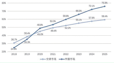 随着汽车信息通信、人工智能、互联网等行业深度融合,智能网联汽车已经进入技术快速演进、产业加速布局的新阶段。IHS Markit数据显示,目前全球市场搭载车联网功能的新车渗透率约为45%,预计至2025年可达到接近60%的市场规模。长期预测,中国智能网联汽车市场将不断增长,至2025年将接近2000万辆,市场渗透率将超过75%以上。