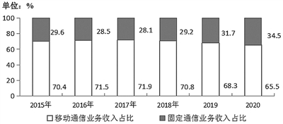 2020年,固定通信业务实现收入4673亿元,比上年增长12%,在电信业务收入中占比达34.5%,占比较上年提高2.8个百分点,占比连续3年提高。