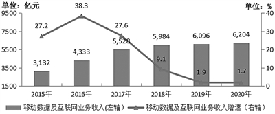 2020年,移动通信业务实现收入8891亿元,比上年下降0.4%,在电信业务收入中占比降至65.5%,比2017年峰值时回落6.4个百分点。其中,移动数据及互联网业务实现收入6204亿元,比上年增长1.7%,在电信业务收入中占比由上年的46.6%下滑到45.7%,拉动电信业务收入增长0.79个百分点,对收入增长贡献率为22.3%。