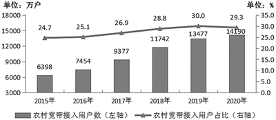 截至2020年年底,全国农村宽带用户总数达1.42亿户,全年净增712万户,比上年末增长5.3%。全国行政村通光纤和4G比例均超过98%,电信普遍服务试点地区平均下载速率超过70M,农村和城市实现“同网同速”。