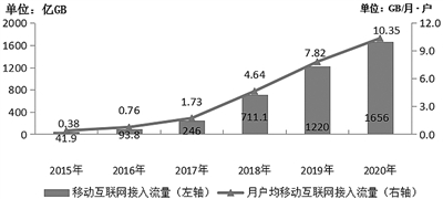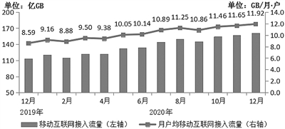 受新冠肺炎疫情冲击和“宅家”新生活模式等影响,移动互联网应用需求激增,线上消费异常活跃,短视频、直播等大流量应用场景拉动移动互联网流量迅猛增长。2020年,移动互联网接入流量消费达1656亿GB,比上年增长35.7%。全年移动互联网月户均流量(DOU)达10.35GB/户·月,比上年增长32%;12月当月DOU高达11.92GB/户·月。其中,手机上网流量达到1568亿GB,比上年增长29.6%,在总流量中占94.7%。