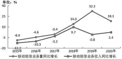 2020年,全国移动短信业务量比上年增长18.1%,增速较上年下降14.1个百分点;移动短信业务收入比上年增长2.4%,移动短信业务量收增速差从上年的33%下降至15.7%。互联网应用对话音业务替代影响继续加深,2020年全国移动电话去话通话时长2.24万亿分钟,比上年下降6.2%。