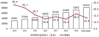 2020年,全国软件和信息技术服务业规模以上企业超4万家,累计完成软件业务收入81616亿元,同比增长13.3%。
