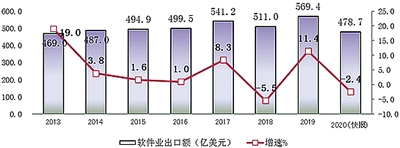 软件出口形势低迷。2020年,全国软件和信息技术服务业实现出口478.7亿美元,同比下降2.4%。