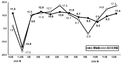 2020年,规模以上电子信息制造业出口交货值同比增长6.4%,增速比上年加快4.7个百分点。12月,规模以上电子信息制造业出口交货值同比增长17.3%,增速比上年加快15.4个百分点。