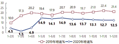 互联网业务收入增长稳中有落。2020年,我国规模以上互联网和相关服务企业(简称互联网企业)完成业务收入12838亿元,同比增长12.5%。全年增速整体低于上年水平,月度呈现前4个月低速增长、5—7月增速达到高点、再逐月小幅回落态势。