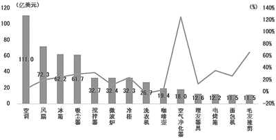 2020年上半年,随着居家时间的增多,人们对冰箱冷柜和部分厨房小家电产品需求率先增大。进入下半年,得益于供应链的快速恢复,海外居家经济的需求拉动,绝大部分品类产品订单大幅增长。综观全年,与防疫相关的冰箱冷柜和厨房家电,以及空气净化器、加湿器等居家创新产品增幅明显,而像洗衣机、电熨斗等与户外衣着相关的产品,以及空调等与商用相关的产品表现乏力。大家电(冰箱、洗衣机和空调等)产品中,尽管冰箱一枝独秀,但整体出口乏力,小家电(环境、厨房、个人护理等产品)各品类表现突出,二者出口形势对比鲜明。