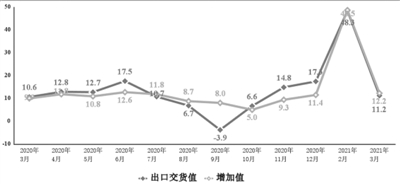 第一季度,规模以上电子信息制造业累计实现出口交货值同比增长31.1%(去年同期为下降5.8%)。3月份,规模以上电子信息制造业实现出口交货值同比增长11.2%,增速比上年同期加快0.6个百分点。