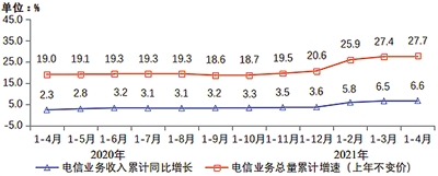 电信业务收入稳步增长。1—4月,电信业务收入累计完成4862亿元,同比增长6.6%,增速同比提升4.3个百分点。按照上年不变价计算的电信业务总量为5180亿元,同比增长27.7%。