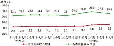 新兴业务收入持续较快增长。三家基础电信企业积极发展IPTV、互联网数据中心、大数据、云计算、人工智能等新兴业务,1—4月共完成新兴业务收入734亿元,同比增长25.8%,在电信业务收入中占比为15.1%,拉动电信业务收入增长3.3个百分点。其中云计算和大数据收入同比增速分别达101.4%和34.3%。