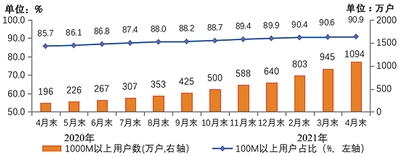 固定宽带接入用户规模稳步增长,千兆用户数已超千万。截至4月末,三家基础电信企业的固定互联网宽带接入用户总数达5.01亿户,比上年末净增1706万户。其中,100Mbps及以上接入速率的固定互联网宽带接入用户达4.55亿户,占总用户数的90.9%,占比较上年末提高1个百分点;1000Mbps及以上接入速率的固定互联网宽带接入用户达1094万户,比上年末净增454万户。
