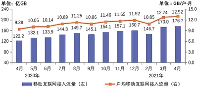 移动互联网流量增速提升,4月DOU值接近13GB/户。1—4月,移动互联网累计流量达659亿GB,同比增长37.7%,增速比1—3月提高2.4个百分点。其中,通过手机上网的流量达到632亿GB,同比增长36.7%,占移动互联网总流量的95.8%。4月当月,户均移动互联网接入流量(DOU)达到12.92GB/户·月,同比增长37.8%,比上年底高1GB/户·月。