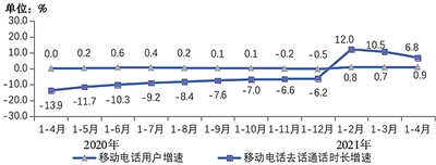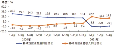 移动电话通话量保持增长,移动短信业务量持续下降。1—4月,移动电话去话通话时长完成7264亿分钟,同比增长6.8%;固定电话主叫通话时长完成309亿分钟,同比下降1.5%。1—4月,全国移动短信业务量同比下降5.1%;移动短信业务收入同比增长17.3%。